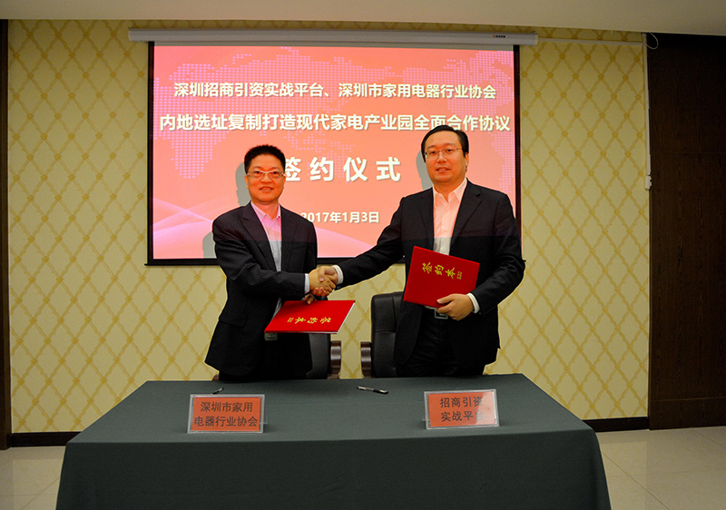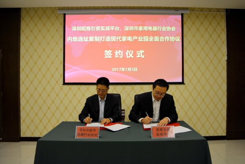 1月3日上午,经过多次对接交流,深圳市家用电器行业协会与招商引资实战平台签署关于在内地复制打造现代家电产业园区的合作协议,双方将整合各自优势资源,发挥各自专业优势,就打造现代家电产业园及相关创新型业务展开一体化合作。深圳市家用电器行业协会全权委托招商平台为现代家电产业园区进行选址落地。